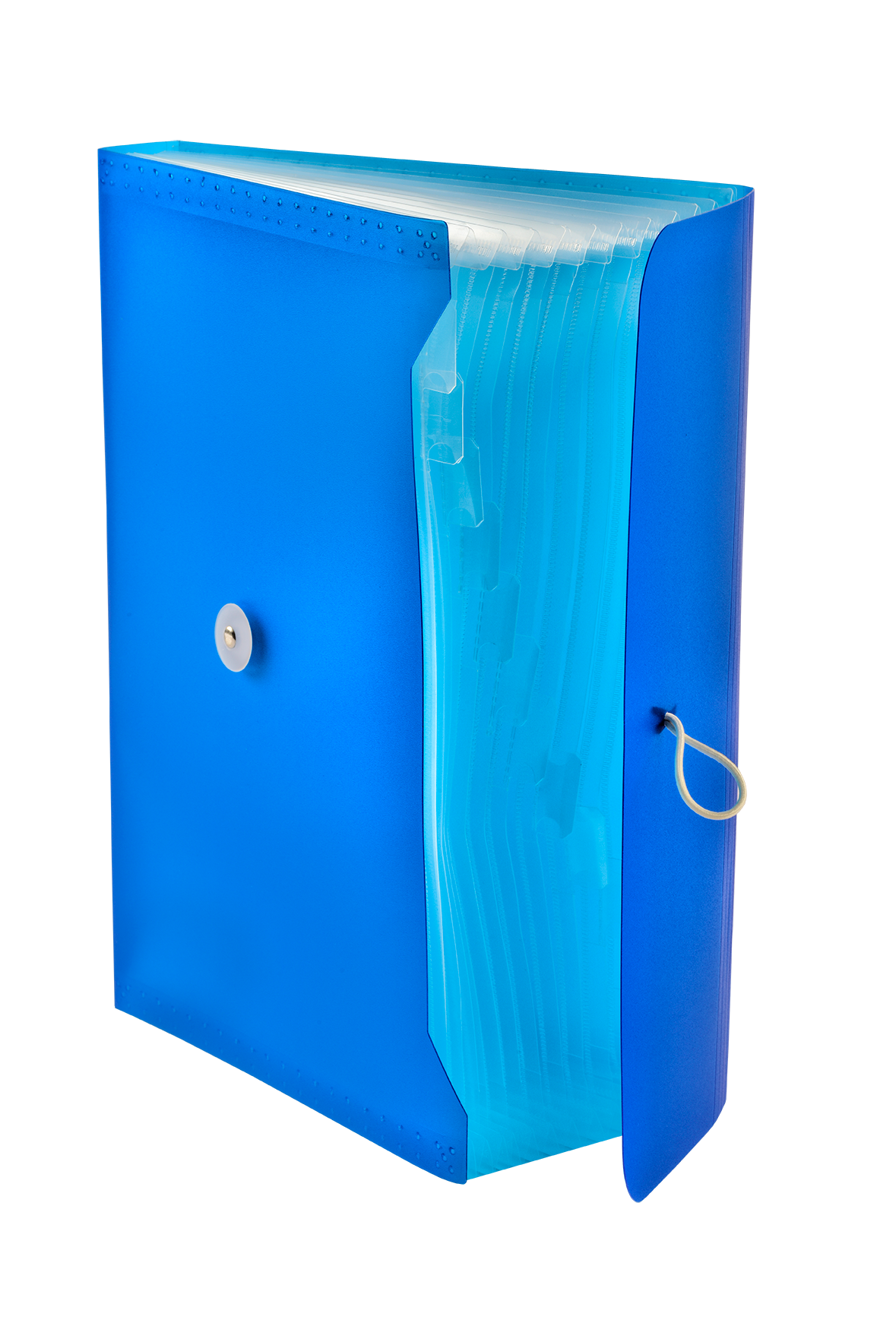 Teczka harmonijkowa PP z gumką, mieszcząca format A4. Teczka posiada 13 przegród. Wymiary teczki: 330x245x35 mm, grubość tworzywa PP: 0,50 mm. Dostępna w pięciu kolorach (niebieski, czerwony, pomarańczowy, żółty, czarny). Opakowanie: folia 1 szt.