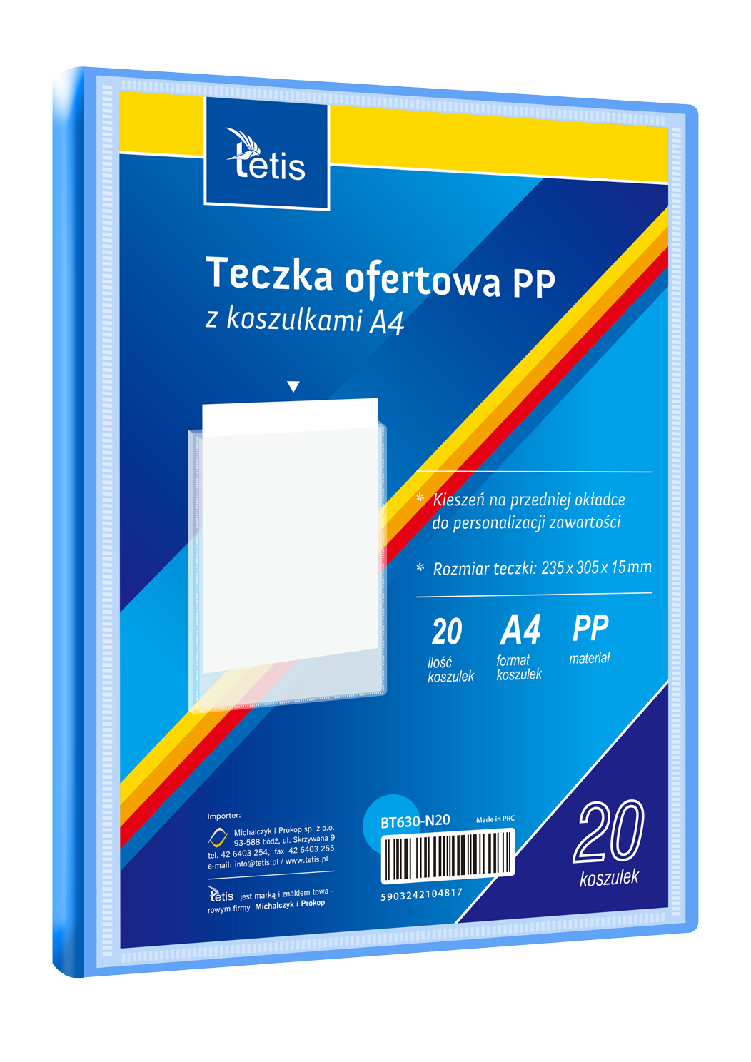 Teczka ofertowa PP z koszulkami. Posiada grzbiet i kieszeń opisową na przedniej okładce, format A4. Wymiary teczki: 305 x 235 mm. Opakowanie: folia 1 szt.