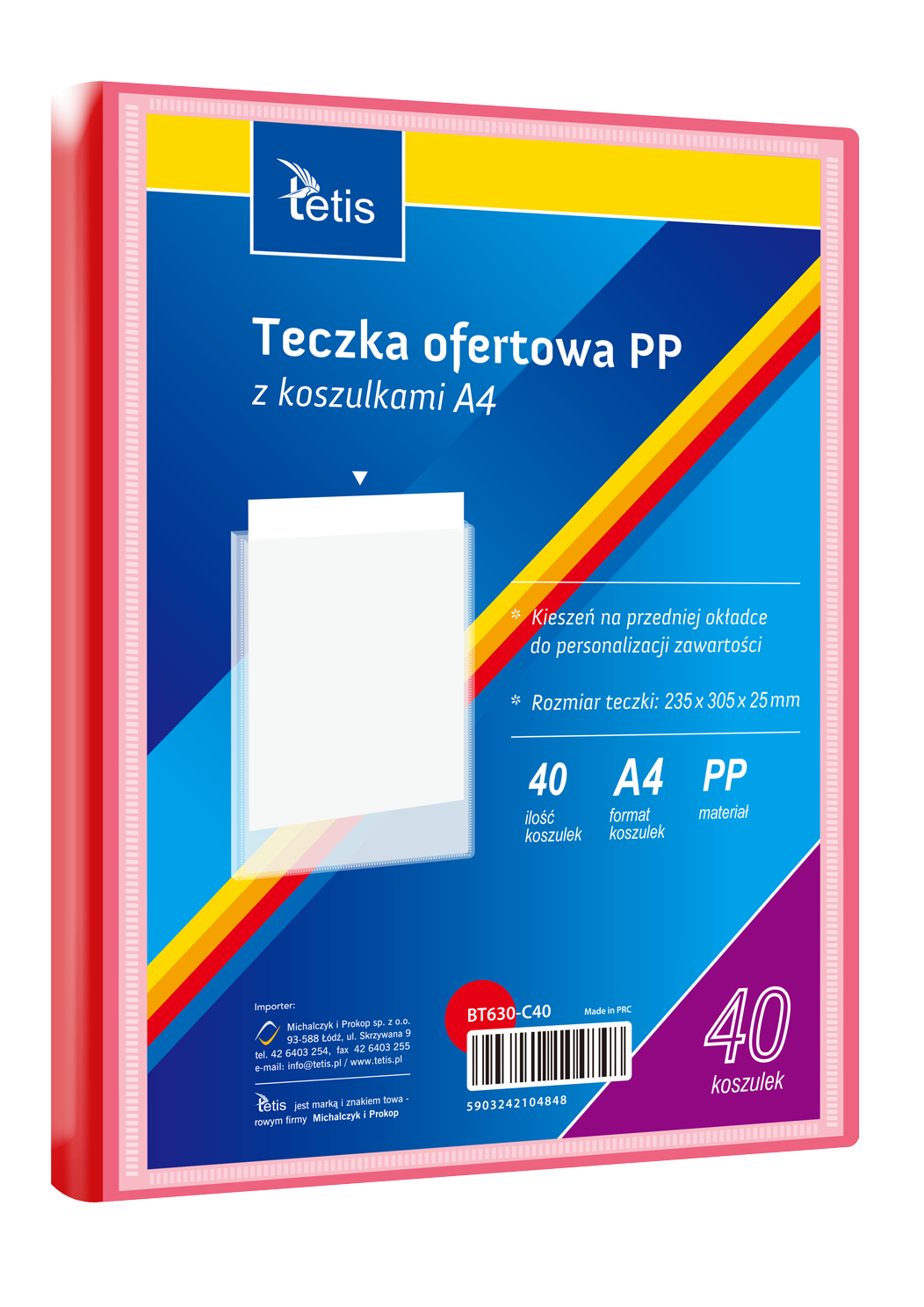 Teczka ofertowa PP z koszulkami. Posiada grzbiet i kieszeń opisową na przedniej okładce, format A4. Wymiary teczki: 305 x 235 mm. Opakowanie: folia 1 szt.