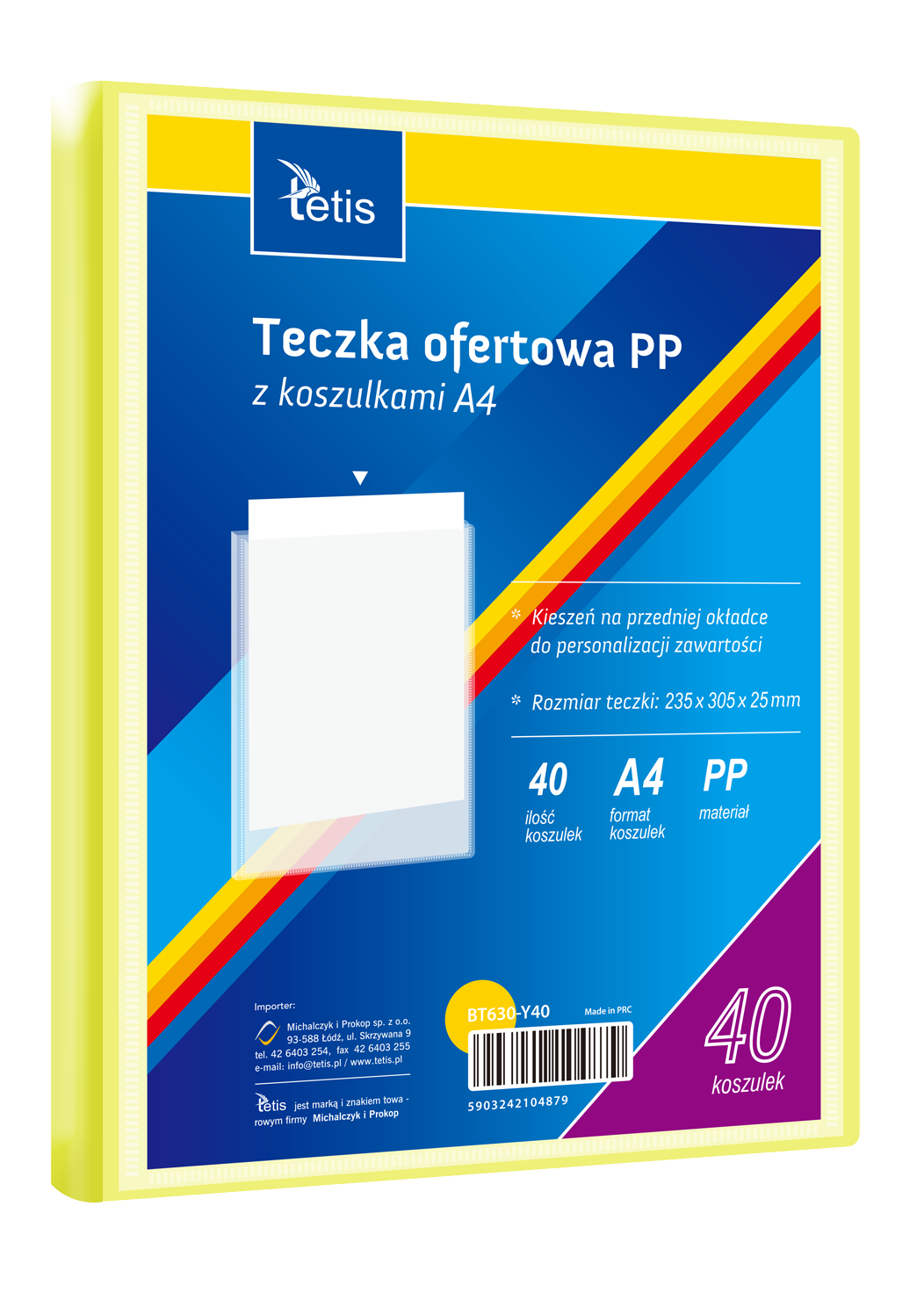 Teczka ofertowa PP z koszulkami. Posiada grzbiet i kieszeń opisową na przedniej okładce, format A4. Wymiary teczki: 305 x 235 mm. Opakowanie: folia 1 szt.