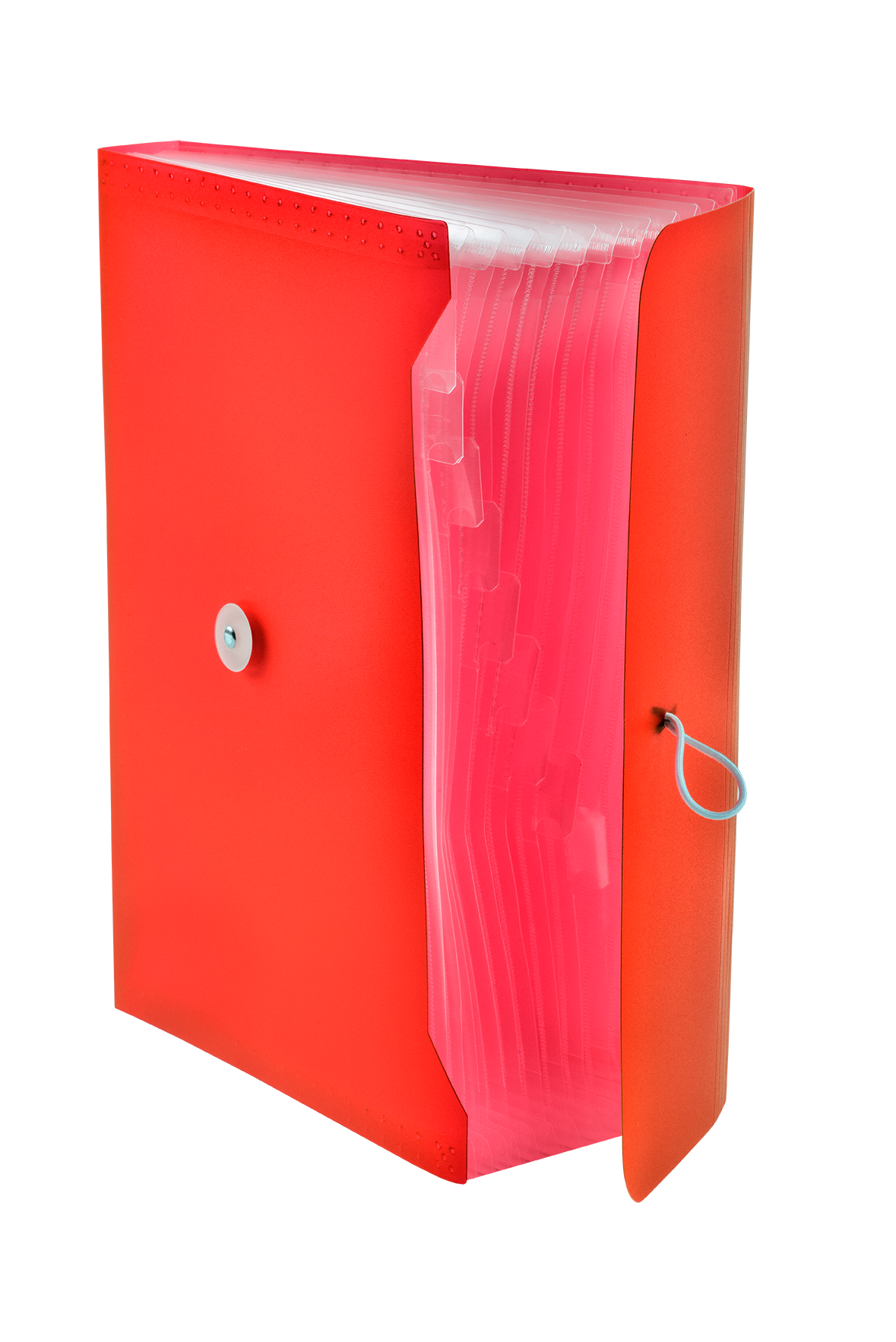Teczka harmonijkowa PP z gumką, mieszcząca format A4. Teczka posiada 13 przegród. Wymiary teczki: 330 x 245 x 35 mm, grubość tworzywa PP: 0,50 mm. Opakowanie: folia 1 szt.