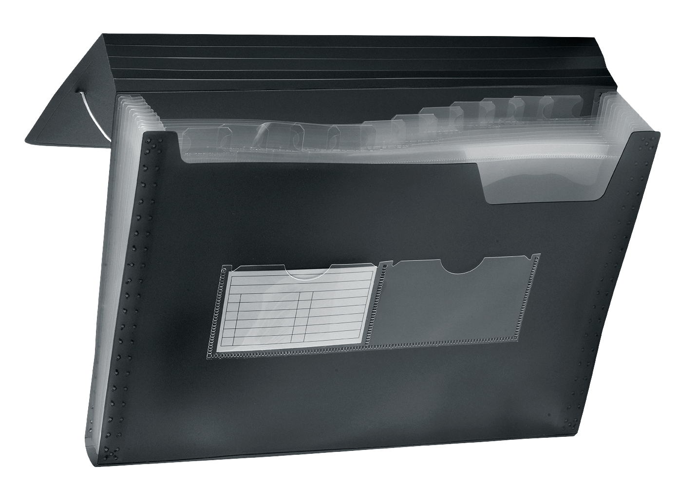 Teczka harmonijkowa PP z gumką narożną, mieszcząca format A4. Teczka posiada 13 przegród. Wymiary teczki: 330 x 245 x 32 mm, grubość tworzywa PP: 0,60 mm. Opakowanie: folia 1 szt.