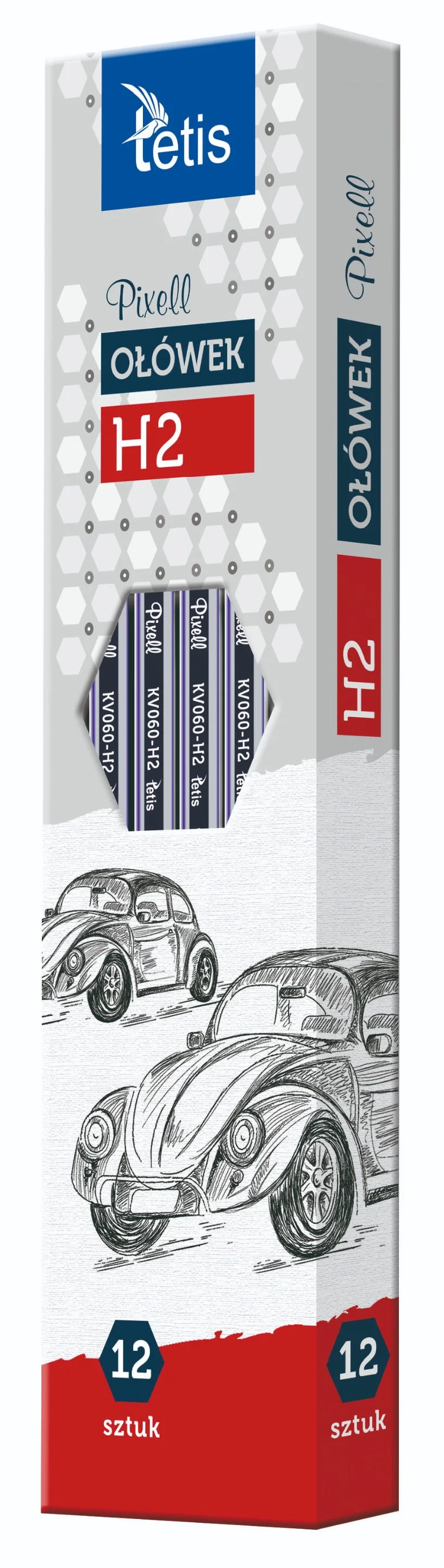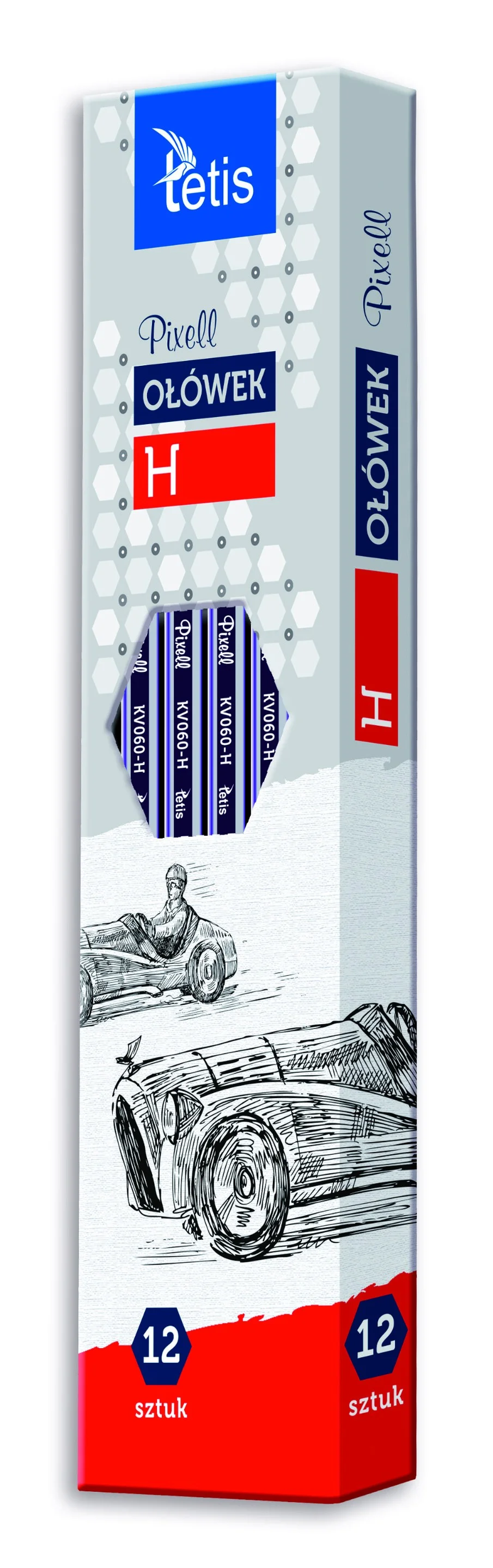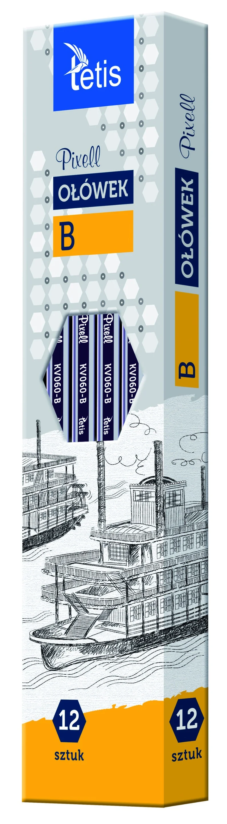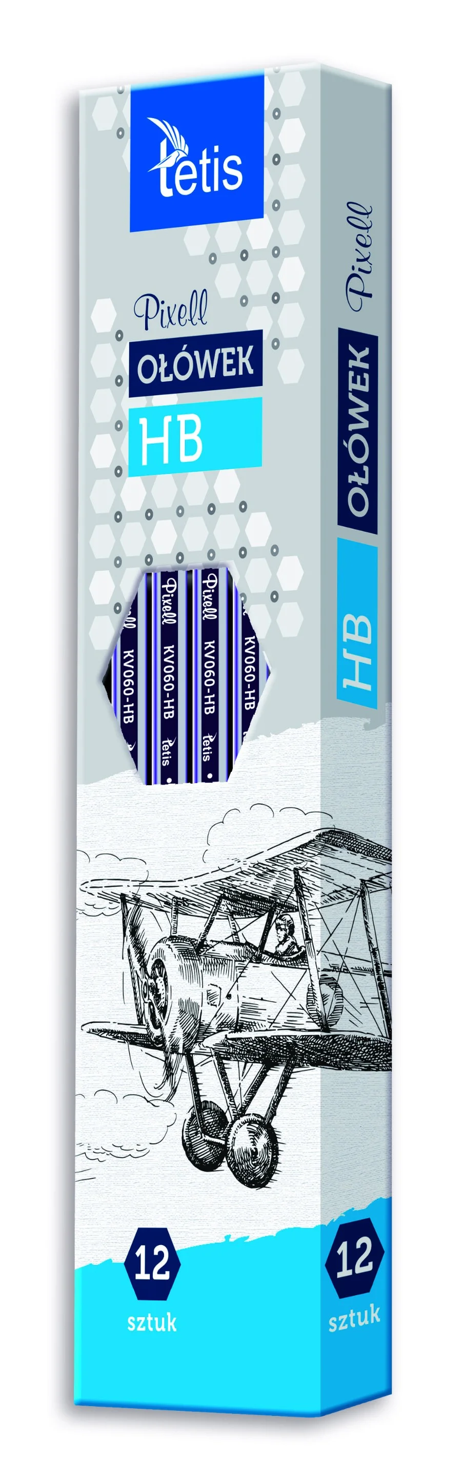 Ołówek drewniany, hexagonalny kształt. Grafit odporny na złamanie. Opakowanie: pudełko 12 sztuk