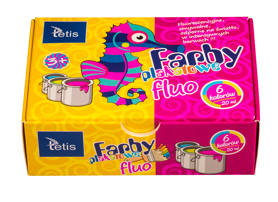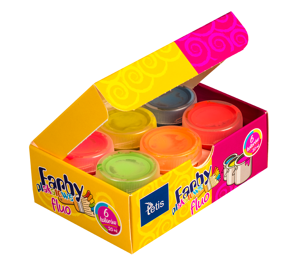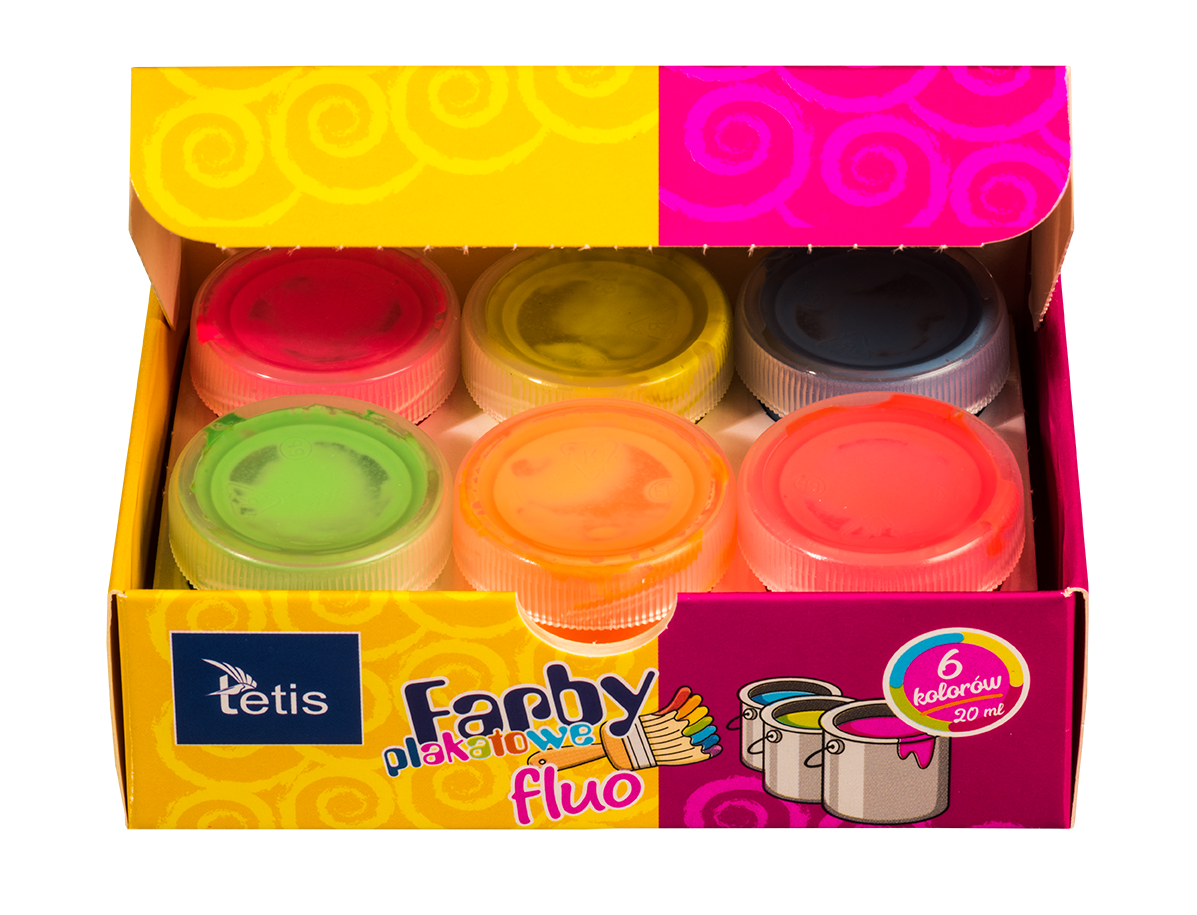 Farby plakatowe fluorescencyjne w intensywnych barwach, odporne na światło, zmywalne.