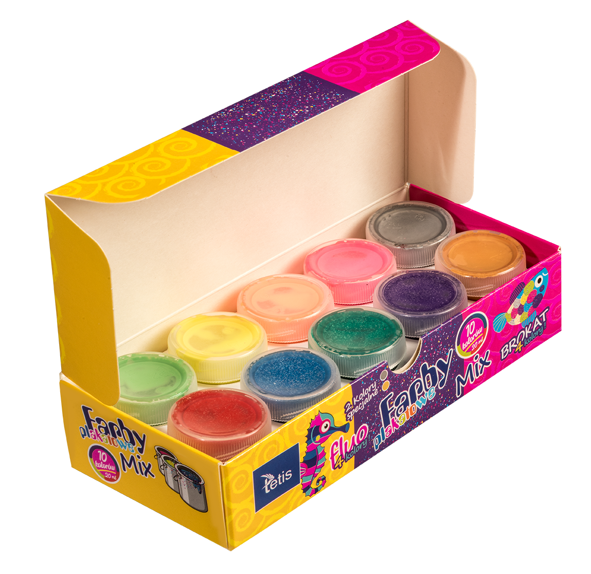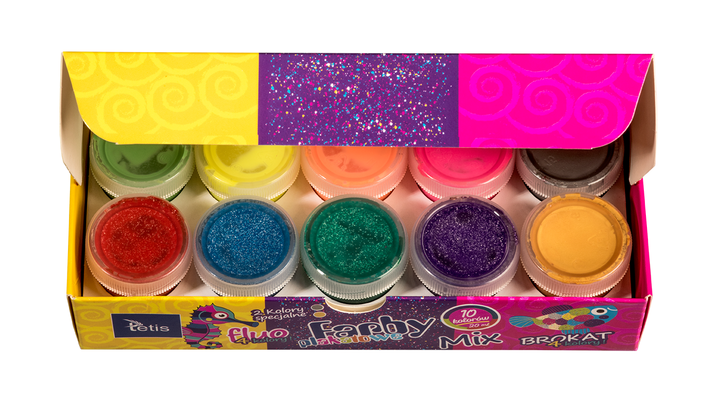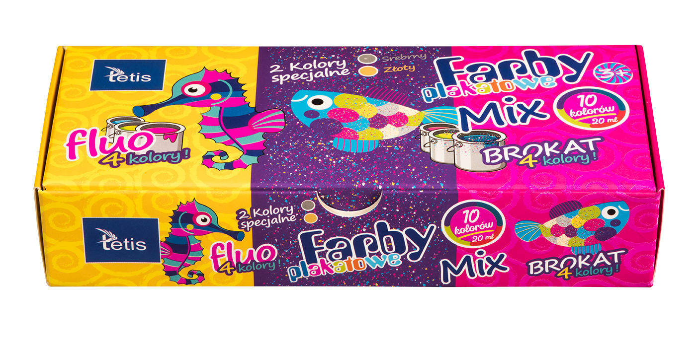 Farby plakatowe mix, zestaw zawiera: 4 kolory fluorescencyjne, 4 kolory brokatowe, 2 kolory specjalne: srebrny, złoty. Odporne na światło, zmywalne.