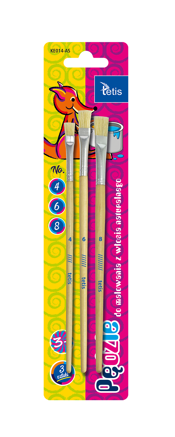Pędzle do malowania z naturalnego, sztywnego włosia. Płaski kształt. Rączka z drewna brzozowego. Opakowanie: display 3 sztuki (dostępne w rozmiarach: 4, 6, 8 (KE014-AS) / 8, 10, 12 (KE014-BS)).