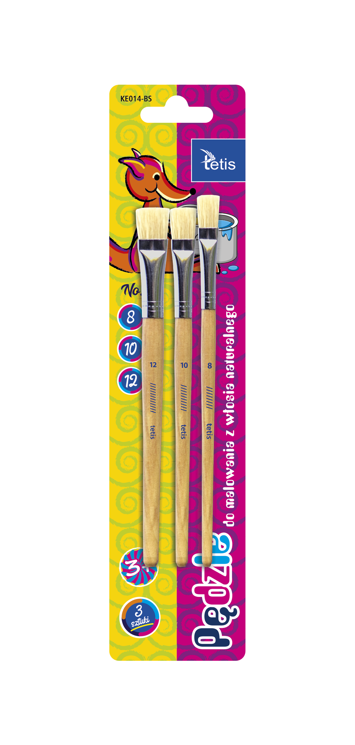 Pędzle do malowania z naturalnego, sztywnego włosia. Płaski kształt. Rączka z drewna brzozowego. Opakowanie: display 3 sztuki (dostępne w rozmiarach: 4, 6, 8 (KE014-AS) / 8, 10, 12 (KE014-BS)).