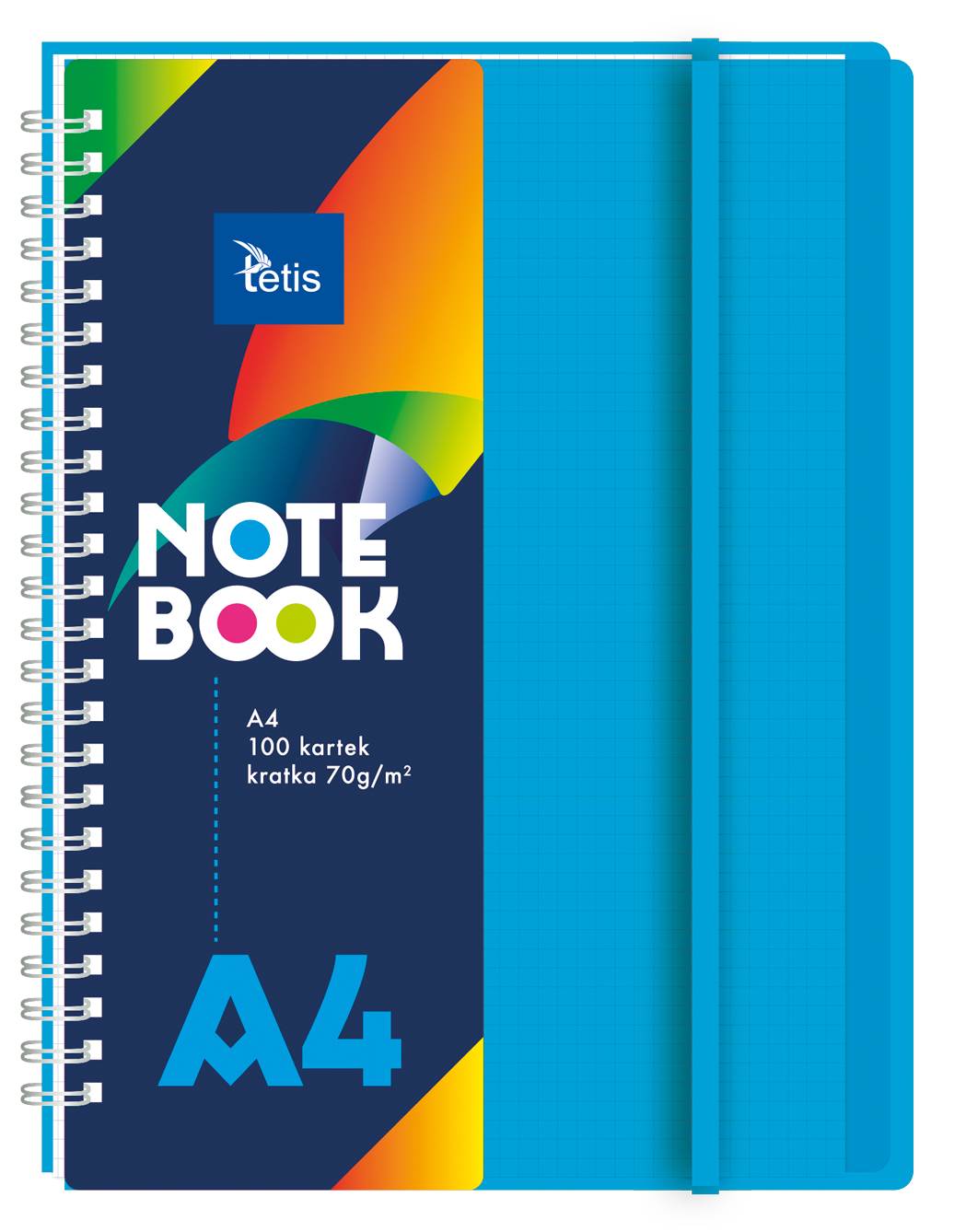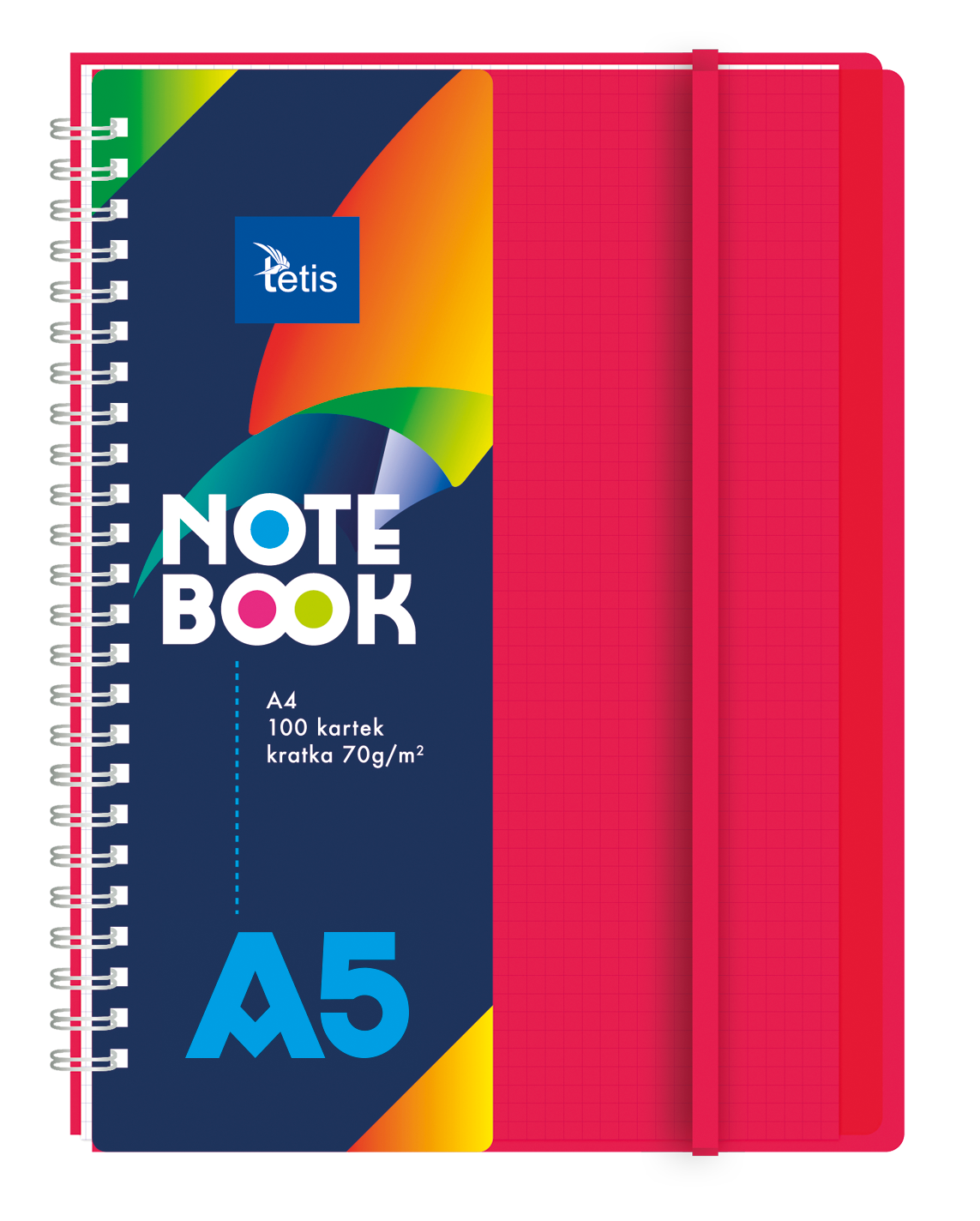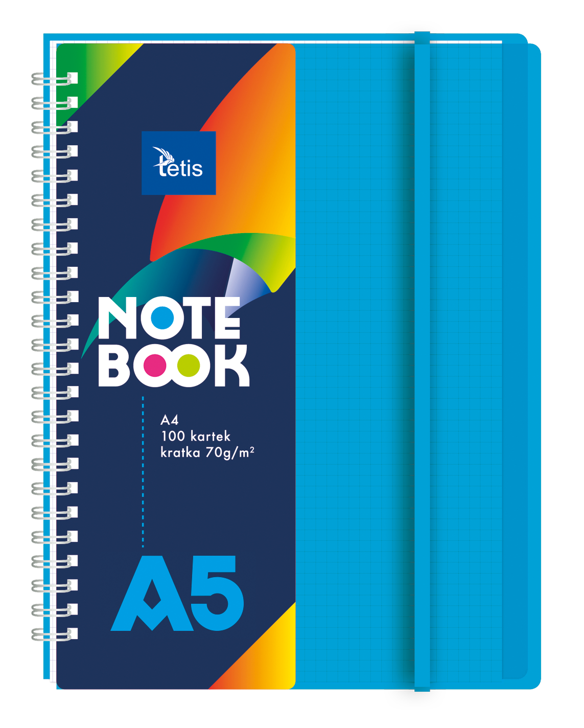 Kołonotatnik w oprawie PP. Posiada plastikowe transparentne przekładki (5 sztuk) i gumkę dopasowaną do koloru okładki. Gramatura papieru: 70 g/m2