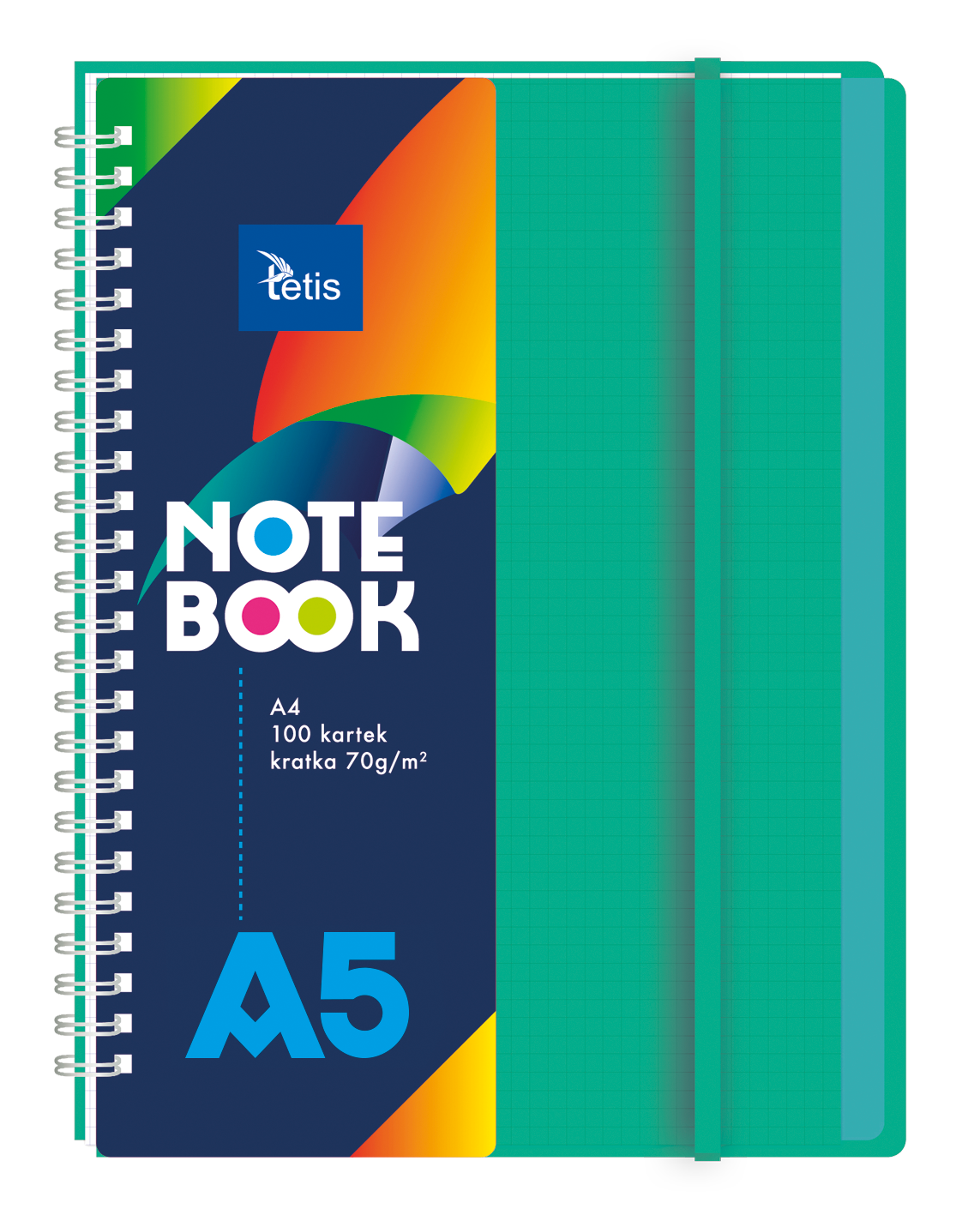 Kołonotatnik w oprawie PP. Posiada plastikowe transparentne przekładki (5 sztuk) i gumkę dopasowaną do koloru okładki. Gramatura papieru: 70 g/m2