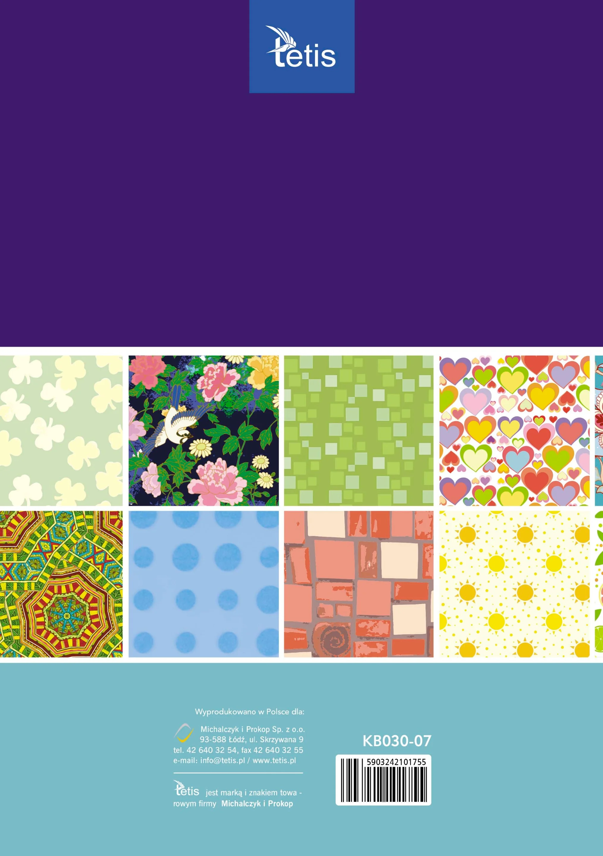 Zestaw 16 jednostronnie zadrukowanych arkuszy ozdobnych. Oprawa zeszytowa. Arkusze posiadają mikroperforację ułatwiającą odrywanie. Papiery ozdobne idealne do prac twórczych, zaproszeń, kartek okolicznościowych, laurek czy zdobienia pudełek prezentowych. Wymiar arkusza 205x292mm. Gramatura 100g/m2.