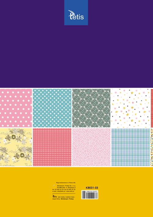 Zestaw 16 jednostronnie zadrukowanych arkuszy ozdobnych. Oprawa zeszytowa. Arkusze posiadają mikroperforację ułatwiającą odrywanie. Papiery ozdobne idealne do prac twórczych, zaproszeń, kartek okolicznościowych, laurek czy zdobienia pudełek prezentowych. Wymiar arkusza 420x295mm. Gramatura 100g/m2.