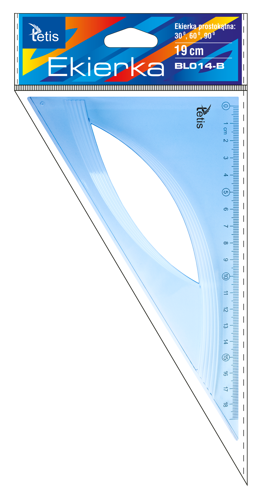 Ekierka prostokątna wykonana z przezroczystego tworzywa z wyraźną skalą. Opakowanie: pudełko 30 sztuk.