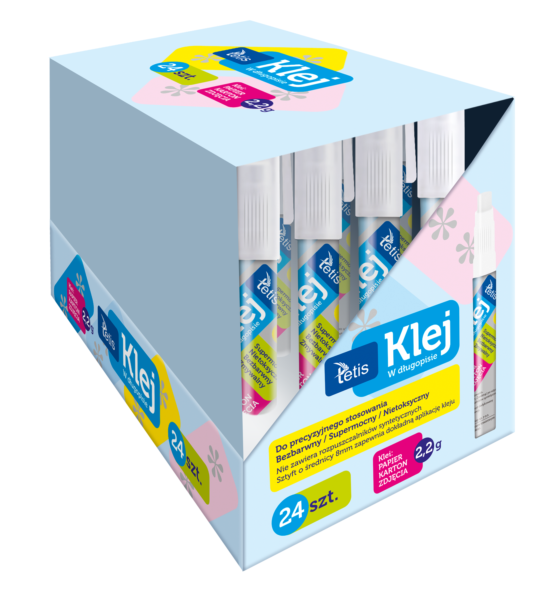 Klej w długopisie. Sztyft o średnicy 8 mm doskonale sprawdzi się do precyzyjnego aplikowania. Supermocny, nietoksyczny, nie zawiera rozpuszczalników syntetycznych, zmywalny. Idealnie klei papier, karton, zdjęcia. Opakowanie: display 24 sztuki