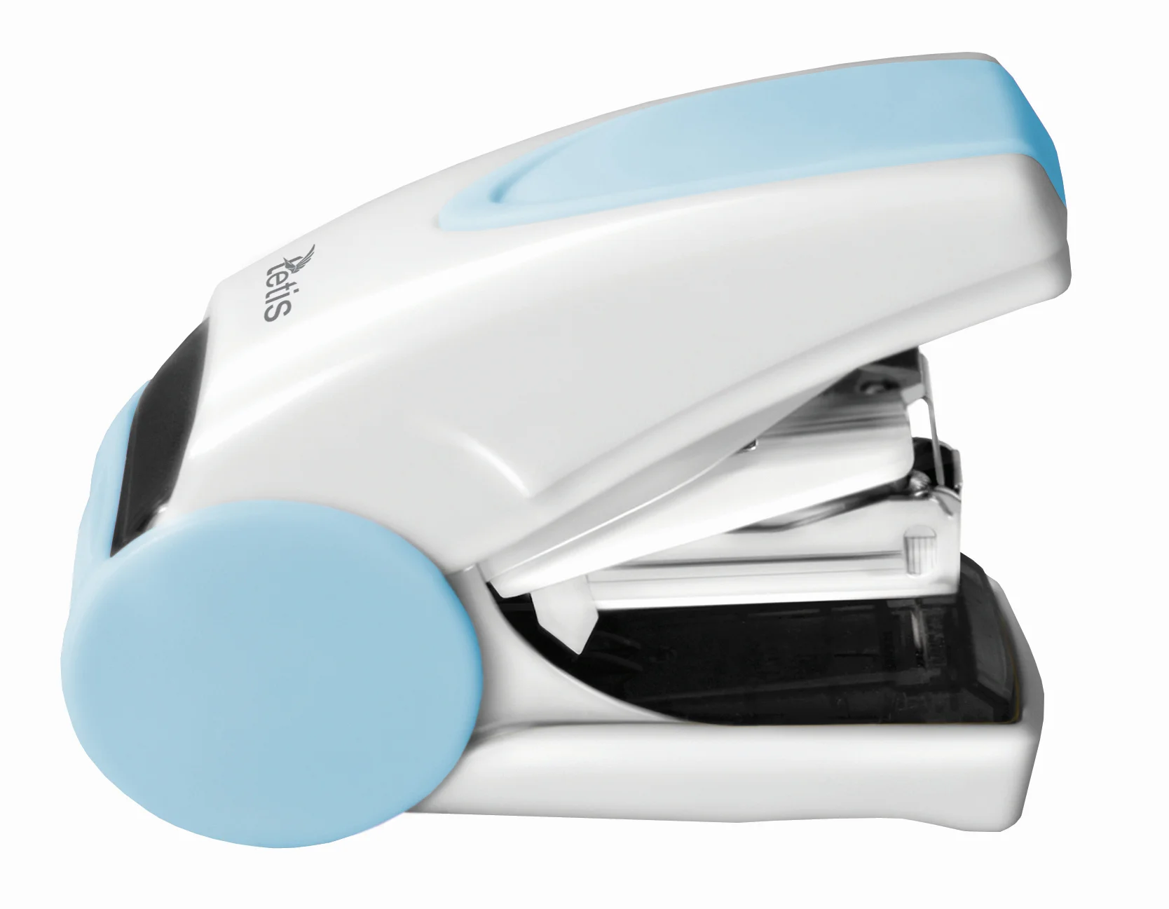 Mini zszywacz w niebiesko-biłej obudowie z tworzywa sztucznego, części mechaniczne metalowe. System zszywania płaskiego pozwala zaoszczędzić 30% wolnego miejsca podczas archiwizacji dokumentów. Specjalnie skonstruowana dźwignia redukuje siłę nacisku do 50%. Dostosowany do zszywek o nr 10. Zszywa do 20 kartek. Dodatkowo wyposażony w metalowy rozszywacz. Głębokość wsuwania kartek: 25mm. Pojemność magazynka: 100 zszywek. Opakowanie: blister.