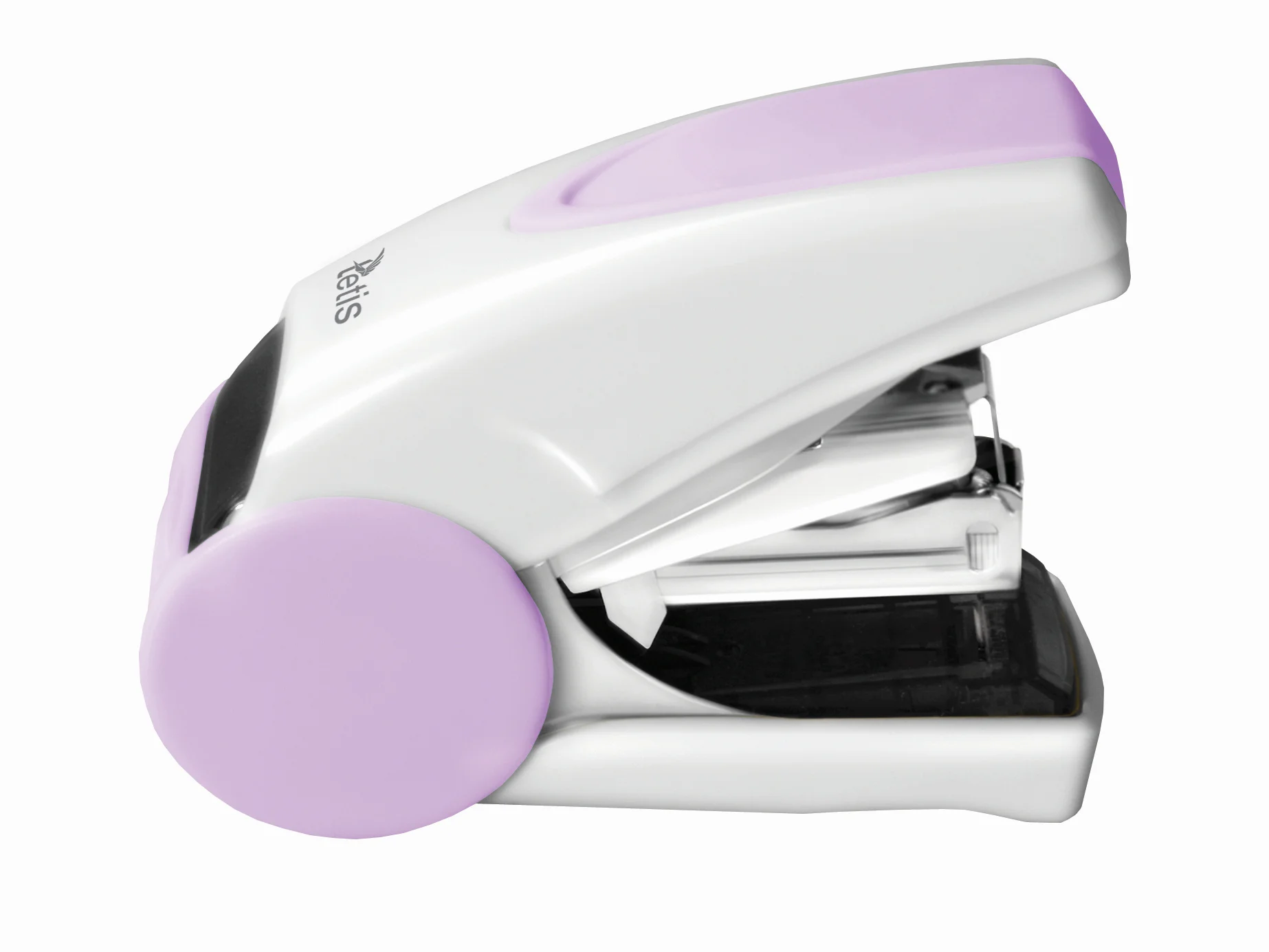 Mini zszywacz w fioletowo-białej obudowie z tworzywa sztucznego, części mechaniczne metalowe. System zszywania płaskiego pozwala zaoszczędzić 30% wolnego miejsca podczas archiwizacji dokumentów. Specjalnie skonstruowana dźwignia redukuje siłę nacisku do 50%. Dostosowany do zszywek o nr 10. Zszywa do 20 kartek. Dodatkowo wyposażony w metalowy rozszywacz. Głębokość wsuwania kartek: 25mm. Pojemność magazynka: 100 zszywek. Opakowanie: blister.