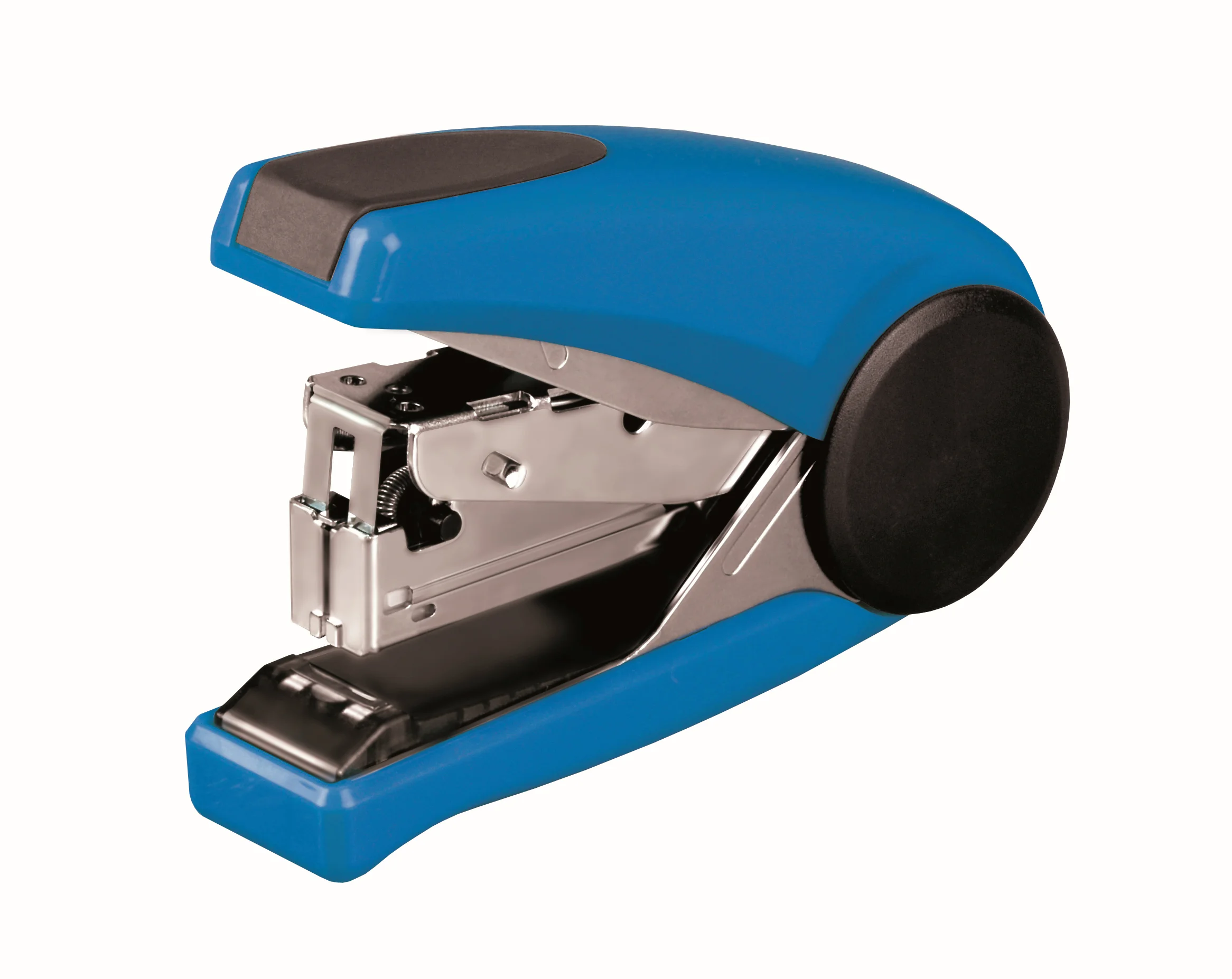 Zszywacz One-Touch w niebiesko-czarnej obudowie z tworzywa sztucznego, części mechaniczne metalowe. System zszywania płaskiego pozwala zaoszczędzić 30% wolnego miejsca podczas archiwizacji dokumentów. Specjalnie skonstruowana dżwignia redukuje siłę nacisku do 50%. Dostosowany do zszywek 24/6 - 26/6. Zszywa do 40 kartek. Głębokość wsuwania kartek: 45 mm. Pojemność magzynka: 100 zszywek. Opakowanie: blister.