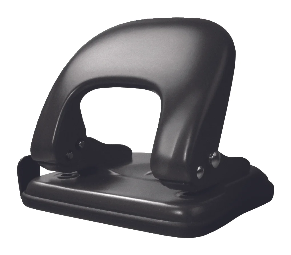 Metalowy dziurkacz biurowy w czarnej, matowej obudowie. Posiada blokadę dźwigni, wskaźnik środka strony i ogranicznik formatu. Dziurkuje do 25 arkuszy. Opakowanie: pudełko.
