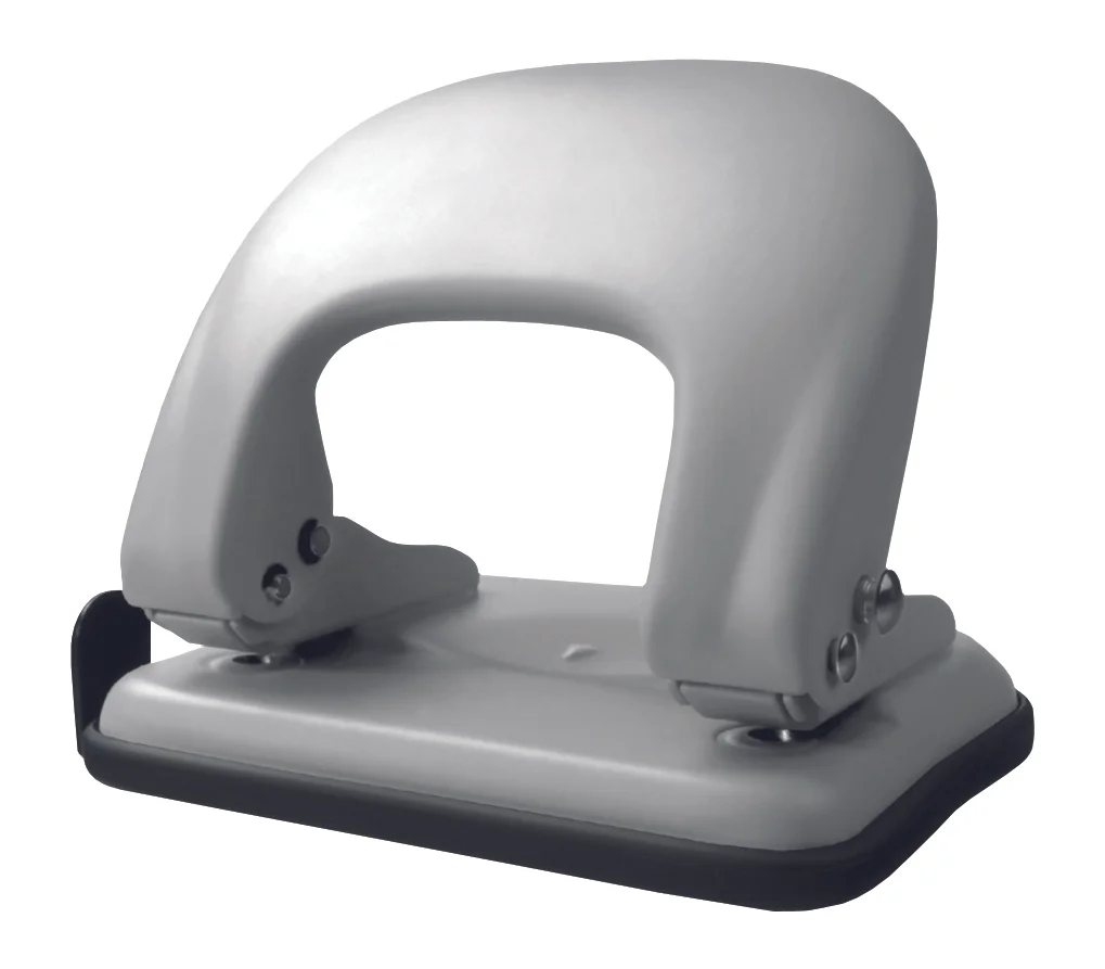 Metalowy dziurkacz biurowy w szarej, matowej obudowie. Posiada blokadę dźwigni, wskaźnik środka strony i ogranicznik formatu. Dziurkuje do 25 arkuszy. Opakowanie: pudełko.