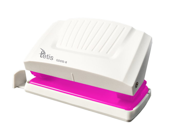 Dziurkacz w obudowie z tworzywa sztucznego z elementami różowego koloru. Części mechaniczne metalowe, wskaźnik środka strony, ogranicznik formatu. Dziurkuje do 12 arkuszy (70 g/m2). Opakowanie: pudełko PP.
