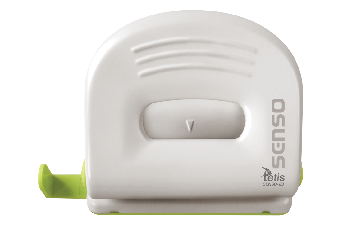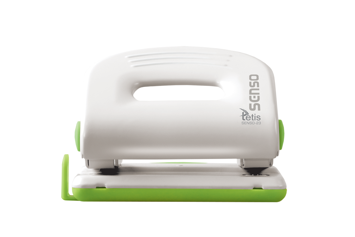 Metalowy dziurkacz biurowy z wykończeniami z tworzywa sztucznego w kolorze biało-zielonym. Posiada wskaźnik środka strony i ogranicznik formatu. Dziurkuje do 25 kartek. Nowatorskie rozwiązanie umożliwia usunięcie konfetti bez zdejmowania całego spodu. Opakowanie: pudełko. 5 lat gwarancji.