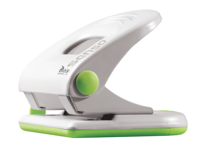 Metalowy dziurkacz biurowy z wykończeniami z tworzywa sztucznego w kolorze biało-zielonym. Posiada wskaźnik środka strony i ogranicznik formatu. Dziurkuje do 40 kartek. Nowatorskie rozwiązanie umożliwia usunięcie konfetti bez zdejmowania całego spodu. Opakowanie: pudełko. 5 lat gwarancji.