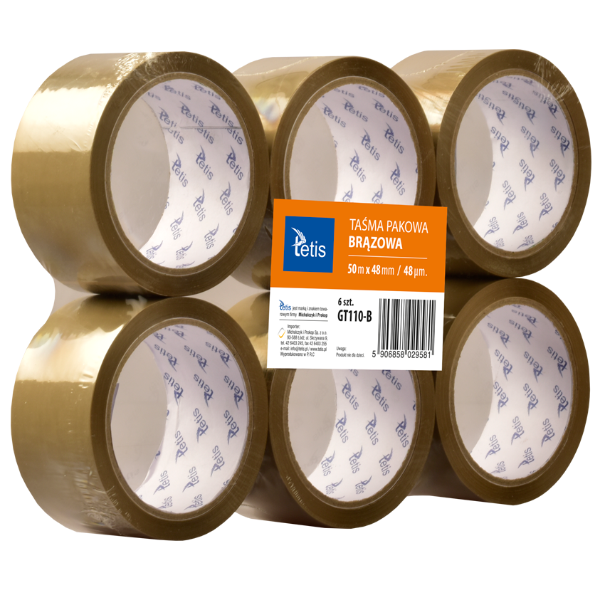 Taśma pakowa brązowa o doskonałej przyczepności i dużej wytrzymałości na rozciąganie. Opakowanie: folia 6 sztuk.