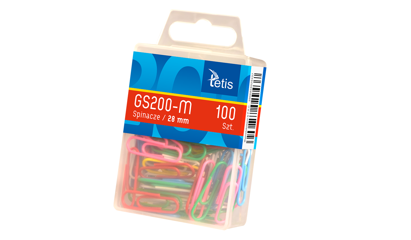 Spinacze biurowe, stalowe pokryte kolorowym plastikiem. Okrągły kształt. Spinacze GS200-M pokryte jednokolorowym plastikiem, model GS200-Z pokryty plastikiem dwukolorowym typu „zebra”. Opakowanie: pudełko 100 sztuk / 12 pudełek po 100 sztuk.