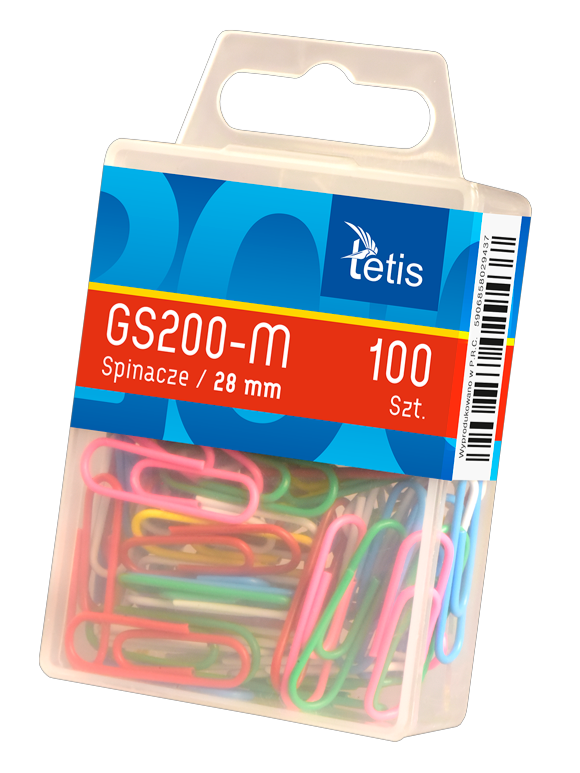 Spinacze biurowe, stalowe pokryte kolorowym plastikiem. Okrągły kształt. Spinacze GS200-M pokryte jednokolorowym plastikiem, model GS200-Z pokryty plastikiem dwukolorowym typu „zebra”. Opakowanie: pudełko 100 sztuk / 12 pudełek po 100 sztuk.