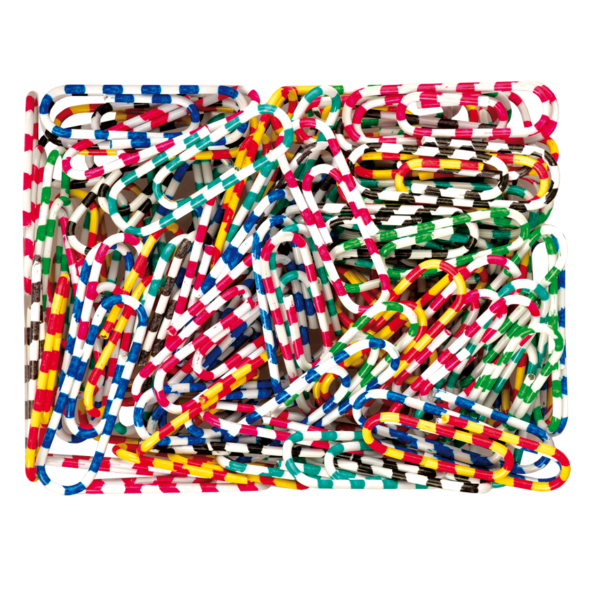Spinacze biurowe, stalowe pokryte kolorowym plastikiem. Okrągły kształt. Spinacze pokryte plastikiem dwukolorowym typu „zebra”. Opakowanie: pudełko 100 sztuk / 12 pudełek po 100 sztuk.